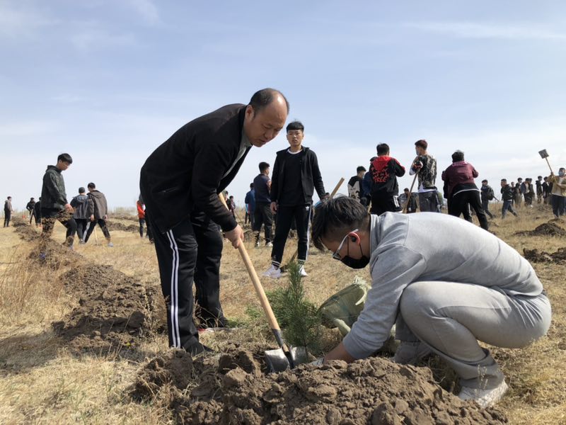 植树现场,师生代表热情高涨、干劲十足,按照专业人员的植树指导,以二人一组随机分组的形式开始植树。大家挥锹铲土、放入树苗、填土压实,道道工序细致认真、有条不紊。一派繁忙有序、热火朝天的景象。