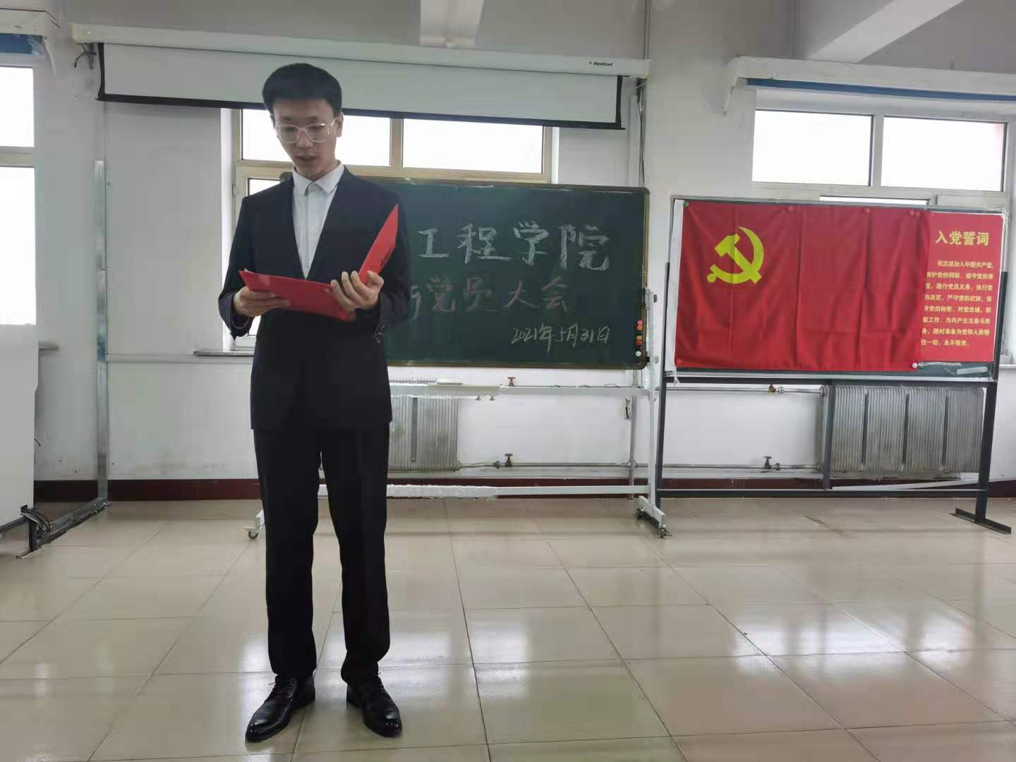 会议由支部书记吴晗主持,党总支书记王旭、副书记汪鑫以普通党员的身份参加组织生活。首先由吴晗老师向支部大会汇报出勤情况,并宣读即将接收的新党员名单。随后,由新党员宣读入党志愿书。发表了自身对党组织的深刻认识,充分表达出自己对党组织的热爱和积极成为党组织一员的迫切希望。接着由各自的两名入党介绍人介绍其培养过程及基本情况,指出他们的缺点并发表意见,愿意介绍他们加入中国共产党。与会正式党员充分进行研究讨论并发表意见。支部大会进行了无记名投票,最后经支部对投票结果的审定,全票通过同意接收赵紫云等67名同志为中共预备党员。