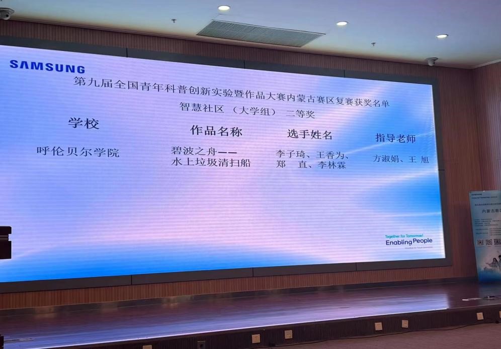 5月21日,第九届全国青年科普创新实验暨作品大赛内蒙古赛区复赛在呼和浩特市内蒙古科技馆举行。该项比赛由内蒙古自治区科协、自治区教育厅主办,共有2203组队伍,4592名选手报名参赛。经过初赛,共10件作品进入智慧社区(大学组)复赛。公司太阳成集团tyc122ccvip教师方淑娟、王旭指导的参赛作品《碧波之洲---水上垃圾清扫船》突出重围,成功进入复赛,并荣获二等奖。