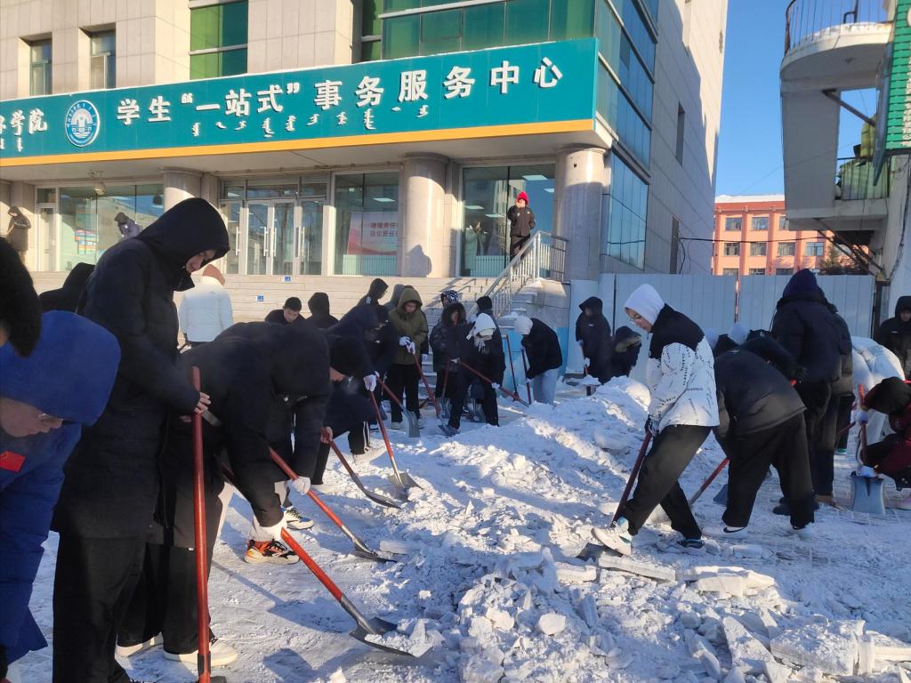 经过一场降雪,道路积雪、路面结冰给广大师生出行带来了极大的不便和安全隐患。为保障正常秩序和师生安全,在团学办主任曹海燕老师的带领下,太阳成集团tyc122ccvip的同学们于12月10日在员工“一站式”事务服务中心门前开展了清雪志愿服务活动。