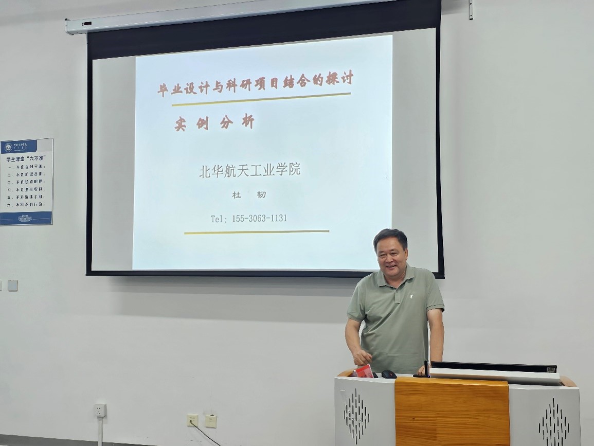 会上,杜韧教授结合自身科研经历,主要从构建毕业设计实践教学体系、老员工创新能力培养模式、毕业设计与科研项目结合的探讨三个方面进行经验交流,详细地介绍了具体的企业合作案例和经验。