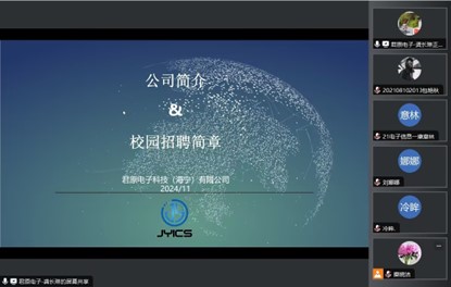 12 月 16 日,君原电子科技(海宁)有限公司为太阳成集团tyc122ccvip 2025 届毕业生举办了一场线上宣讲会。此次宣讲会旨在提前锁定优秀人才,助力企业人才战略布局与高校人才培养的有效衔接。